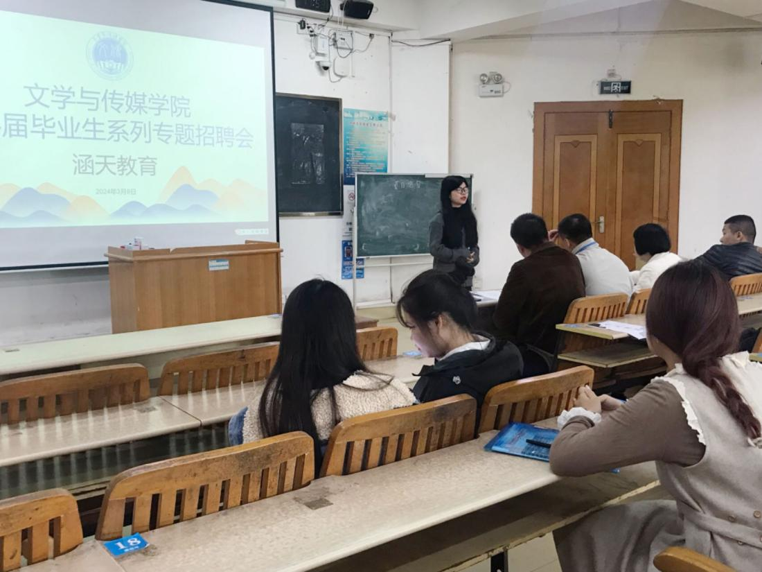 3月6日上午,15vip太阳集团在明理楼N303教室进行了梧州市涵天教育学校的校园专场招聘宣讲会。涵天教育集团有关负责人参加招聘会,15vip太阳集团有意向的应届毕业生到场应聘。涵天教育学校负责人黎金群详细介绍了校园专场招聘岗位和招聘需求,诚邀文学与传媒学院等学院毕业生加入。